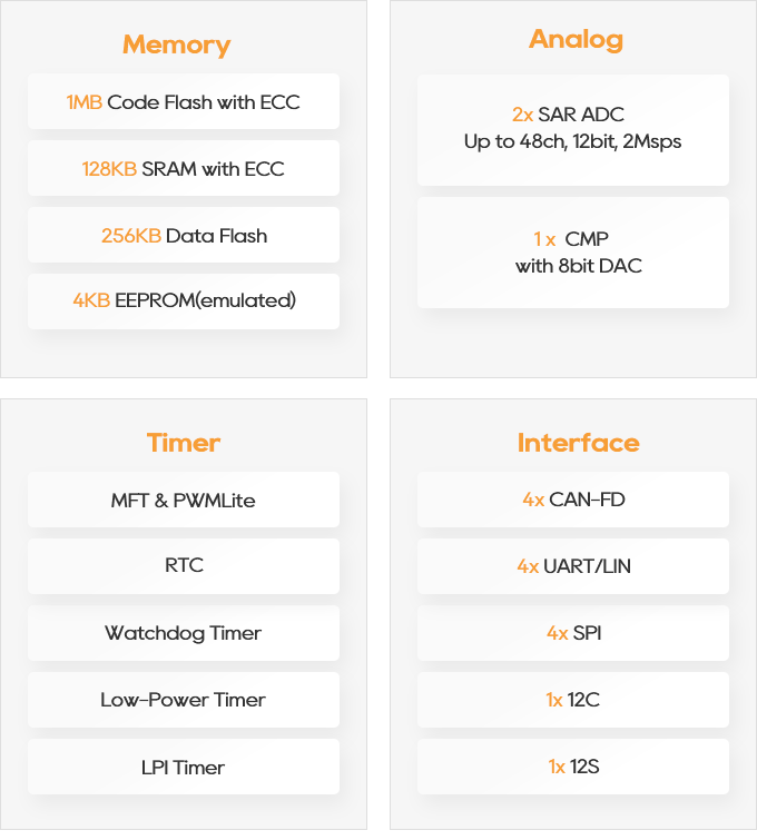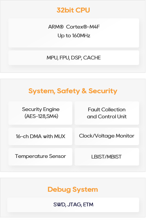 CVM014x系列32位微控制器专为嵌入式应用设计,具有通用性、高性能、高可靠的特点。已获得德国莱茵颁发的ISO26262 ASIL-D功能安全流程认证,以及国创中心颁发的ISO26262 ASIL-B功能安全产品认证,公司全系产品均通过AEC-Q100车规可靠性测试标准,并内嵌信息安全模块及加密引擎。