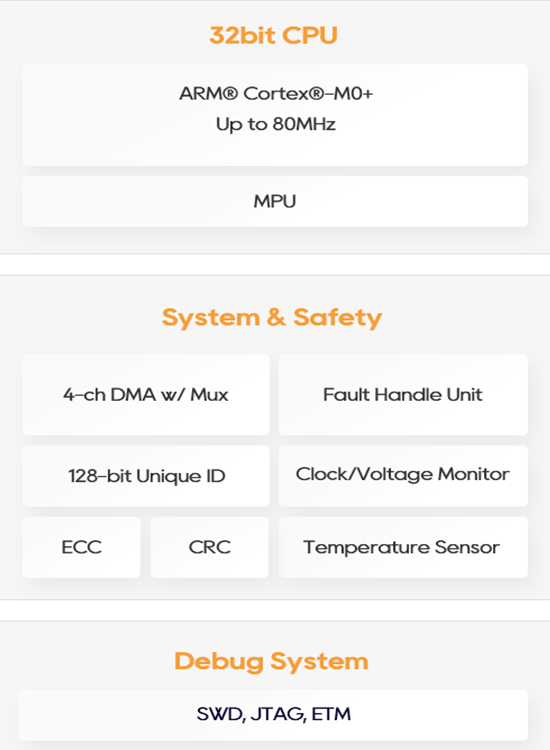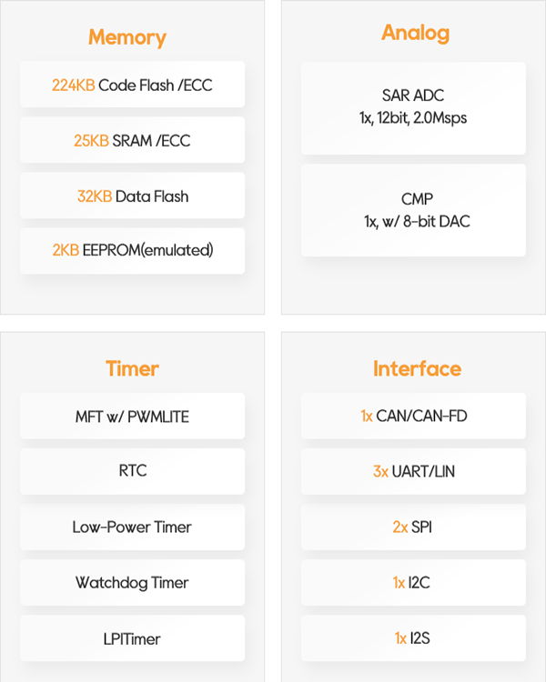 CVM011x系列32位微控制器专为嵌入式应用设计,具有通用性、高性能、高可靠的特点。 产品基于40nm车规级eflash工艺开发,使用ARM Cortex M0+内核,片上集成CANFD/LIN/ADC/PWM/I2C/I2S等外设模块,支持ISELED协议;通过AEC-Q100 Grade 1车规可靠性认证;
